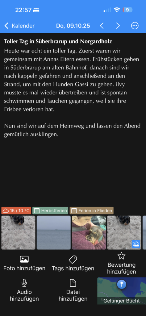 Neben Texten kann ich auch Sprachnotizen anfügen, wenn ich keine Lust habe zu tippen. Ich kann meinen Standort speichern, Schlagwörter vergeben oder einzelne Einträge als Favoriten markieren. Und das Beste: Ich kann auch Dateien aller Art anhängen – egal ob PDFs, Dokumente oder andere Formate, die mir helfen, bestimmte Tage oder Ereignisse noch besser festzuhalten.