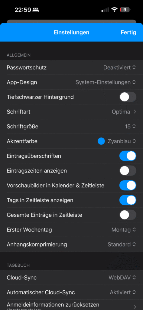 Was mir auch gut gefällt: Diarium bietet einige Einstellmöglichkeiten fürs Design. Ich nutze den tiefschwarzen Hintergrund, weil das für mich angenehmer zu lesen ist. Schriftart und Schriftgröße lassen sich ebenfalls individuell anpassen, genauso wie die Akzentfarbe. So wird die App wirklich zu meinem persönlichen Tagebuch.