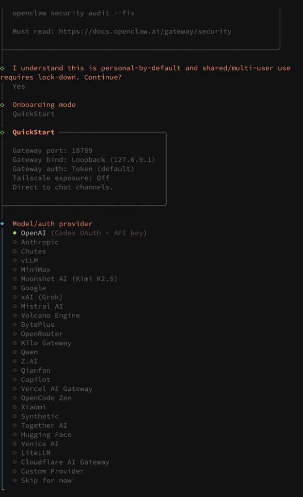 Der Assistent der damit gestartet wird, fragt dich dann durch die Grundkonfiguration. Dabei richtest du den Dienst ein, legst die ersten Einstellungen fest und verbindest OpenClaw mit einem Modellanbieter. Genau dieser Teil ist für Laien am angenehmsten, weil du nicht jede Datei per Hand anfassen musst.
