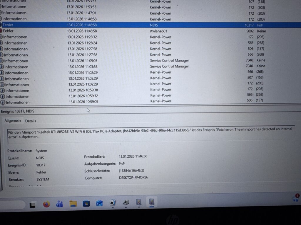 Gerät: HP 255 G10 WLAN: Realtek RTL8852BE WiFi 6 802.11ax PCIe Adapter Symptom: WLAN bricht ab oder verschwindet, nach Neustart manchmal wieder da.