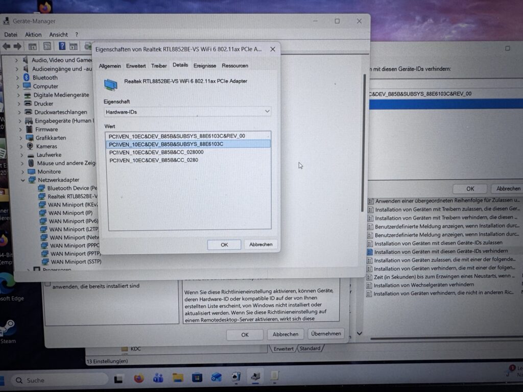 Win + X drücken → Geräte-Manager öffnen. Unter Netzwerkadapter den problematischen Adapter suchen. Bei mir: Realtek RTL8852BE WiFi 6 802.11ax PCIe Adapter. Rechtsklick → Eigenschaften. Reiter Details wählen. In der Dropdown-Liste Hardware-IDs auswählen.